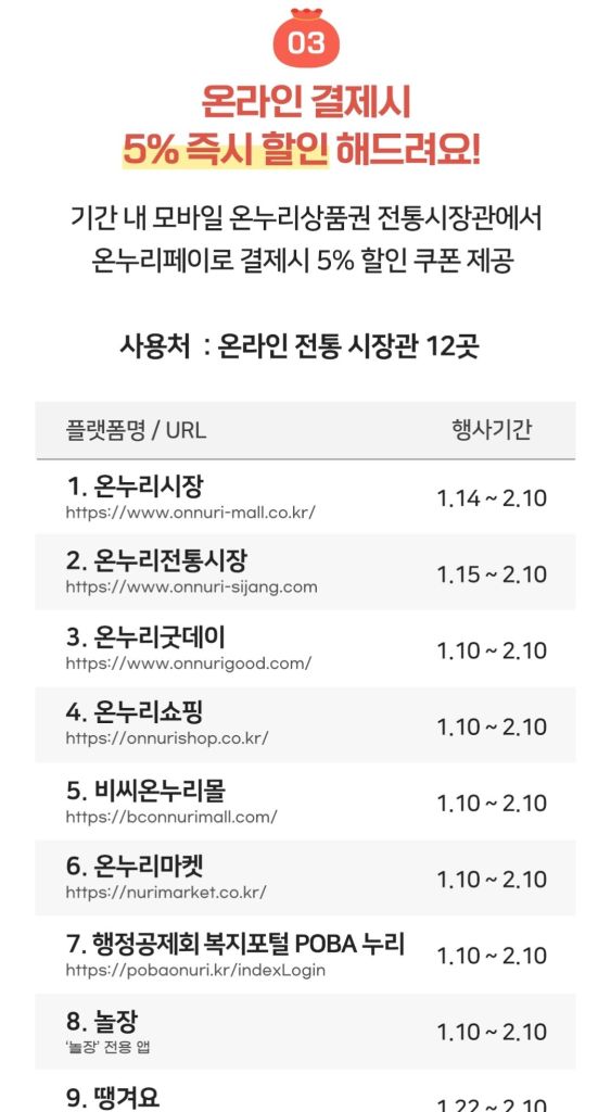 5. 온라인 사용 혜택: 온누리전통시장몰 5% 할인 쿠폰!