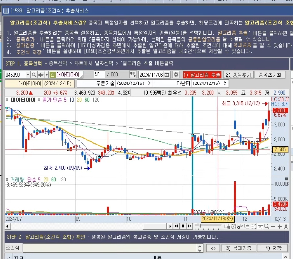 키움증권 영웅문4에서 좌상단에 돋보기를 보면 1539라고 입력하든 알고리즘으로 검색해 보시면 위의 내용을 테스트해 볼 수 있는데, 원하는 공통된 어떤 여러분만의 자리가 있다면, 그걸 조건식으로 만들어보세요.